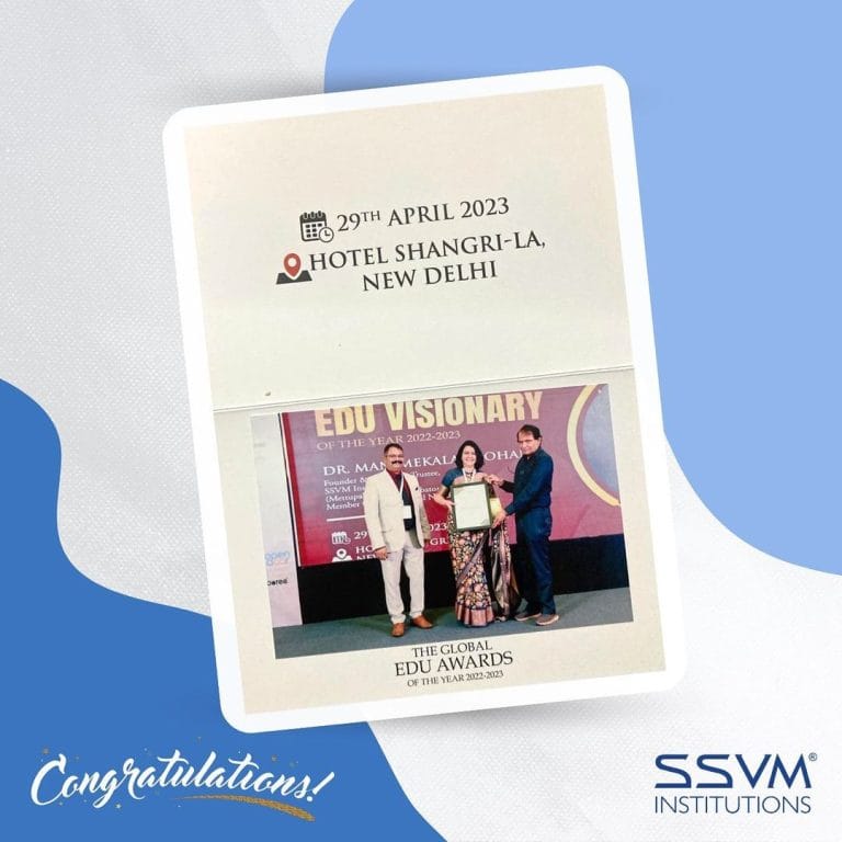 SSVM® Group of Institutions has emerged as a stalwart in education mentoring young intellects and instilling a love for learning since its establishment on 30 September 1998. What started as a modest play school hosting only 25 students in a rented building has flourished into an impressive network of 17 schools. SSVM® has transformed into a bastion of learning renowned for its dedication to educational excellence through the proactive leadership of Dr. Manimekalai Mohan.